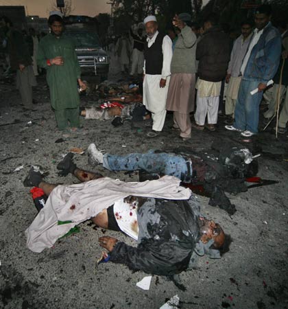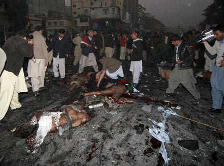 中新網(wǎng)12月27日電 據(jù)路透社報(bào)道,巴基斯坦前總理貝-布托今日在競(jìng)選集會(huì)上遭到炸彈襲擊,不治身亡。圖為爆炸現(xiàn)場(chǎng)。(關(guān)新)