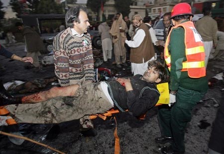 中新網(wǎng)12月27日電 據(jù)法新社報道,巴基斯坦前總理貝-布托今日在競選集會上遭到炸彈襲擊,不治身亡。圖為救援人員現(xiàn)場搶救傷者。(關(guān)新)