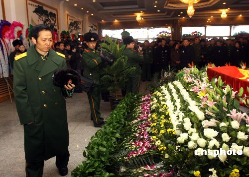 公安部消防局副局長(zhǎng)李世雄在烏魯木齊市殯儀館送別三位烈士。