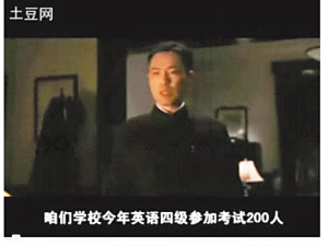 于是,惡搞版《色,戒》出爐了:易先生變成梁校長(zhǎng),收到副官的“四級(jí)考試有人作弊”報(bào)告后,下令補(bǔ)考否則不能畢業(yè),而王力宏及一幫掙扎在四級(jí)苦海中的學(xué)生毅然決定派王佳芝作弊,找個(gè)補(bǔ)考老師(庹宗華),實(shí)行“一人吃飽,全家不餓”的作弊方式,但校方道高一丈,派出“無間道”班底的監(jiān)聽員,最終一網(wǎng)打盡,王佳芝與鄺裕民被處以開除學(xué)籍的處分。