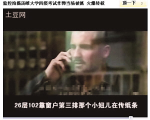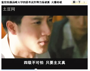 視頻的高潮出現(xiàn)在校方采取的反作弊行動(dòng),畫面切換成《無間道1》中黃秋生部署抓琛哥,臺(tái)詞卻換成:“這次四級(jí)考試,梁校長(zhǎng)下令狠抓作弊,所以我們采用高科技無線遠(yuǎn)程監(jiān)考,考試的時(shí)候,大家用望遠(yuǎn)鏡遠(yuǎn)距離瞅著考場(chǎng),一旦發(fā)現(xiàn)作弊的,立馬用手機(jī)報(bào)告抓捕大隊(duì),一個(gè)活口不留!辈⒓尤肼(lián)通廣告元素。接下來,《越獄》里的林肯“奉命”拿著望遠(yuǎn)鏡報(bào)告:“26層102窗戶第三排那個(gè)小妞在傳紙條!薄缎略鷰熋谩防锏姆街蠸ir接獲報(bào)告后立馬拿著呼叫器大叫:“好,我們立馬去逮。”最后,王佳芝和鄺裕民雙手被縛,跪在石礦場(chǎng)上,這時(shí)配上校方用無比嚴(yán)肅口吻說出的“宣判詞”:“王佳芝等同學(xué)作弊,違背了天天學(xué)習(xí),好好向上的校訓(xùn),現(xiàn)處以開除學(xué)籍處分!