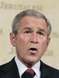 布什在與以色列總理奧爾默特會談結(jié)束后表示:“伊朗是全世界的威脅。我想重復(fù)以前說過的一句話:如世界各國不團(tuán)結(jié)一致阻止伊朗獲得研制核武器的技術(shù),那么它過去、現(xiàn)在和將來都是威脅!