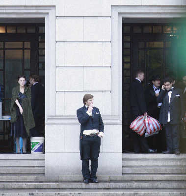 晚上6時半,參與拍攝的外籍群眾演員紛紛領(lǐng)到報酬。從遠處看,似乎外籍群眾演員的報酬明顯優(yōu)于國內(nèi)的群眾演員。一位年輕的男性群眾演員手上的百元大鈔數(shù)到了十張。而基本上每個群眾演員到手的片酬都在400元左右,讓人不免猜測他們是否按美金計算日薪。有些老外似乎還對自己的工作回報不滿。只聽得分發(fā)薪水的劇組工作人員無奈地對一位老外說:“我知道你來得早,但真的不可能給你再加錢了!