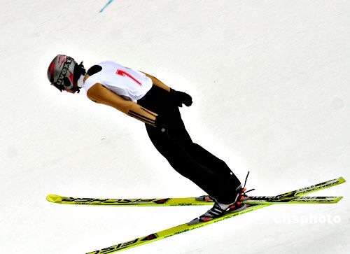 2008年1月23日上午,男子K90M個人跳臺滑雪開始比賽,全國冬運會第六天哈爾濱亞布力滑雪場下起了小雪,對此項比賽有所影響。通化市運動員田占東一跳奪冠,二三名分別被通化市另外兩位運動員李洋和王建勛獲得。中新社發(fā) 姚庭山 攝