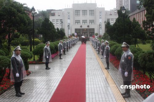 數(shù)十位腳登高筒皮靴的警官冒雨列隊在“立法院”紅地毯兩側(cè),迎接前來報到宣誓就職的臺灣第七屆“立法委員”。