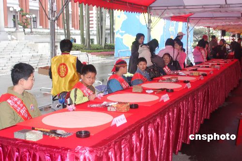 圖為最近一年內(nèi)在臺(tái)灣書法比賽中獲獎(jiǎng)的十位中小學(xué)生應(yīng)邀在開筆大會(huì)上揮毫。