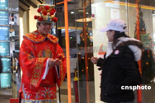 中國春節(jié)假期,臺北市許多店家想辦法招攬顧客。圖為信義商圈的一家電器店員身著古裝向顧客派發(fā)紅包。