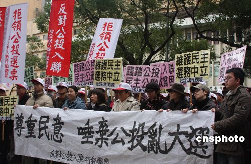 臺(tái)灣“中央選舉委員會(huì)”將從2月27日起主辦十場(chǎng)“入聯(lián)公投”、“返聯(lián)公投”意見發(fā)表會(huì)或辯論會(huì),14日是反方代表申請(qǐng)期限。臺(tái)灣勞動(dòng)黨主席吳榮元、民主行動(dòng)聯(lián)盟總召集人黃光國(guó)到“中選會(huì)”遞交公投反方代表申請(qǐng)書,他們還率領(lǐng)“反公投入聯(lián)行動(dòng)聯(lián)盟”成員在“中選會(huì)”前表達(dá)訴求,群眾高舉“反對(duì)公投入聯(lián),拒領(lǐng)公投票”等標(biāo)語(yǔ),主張拒領(lǐng)公投票,要求中國(guó)國(guó)民黨與民主進(jìn)步黨拋棄“公投入聯(lián)”、“公投返聯(lián)”議題。中新社發(fā) 耿軍 攝