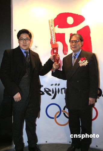 香港體協(xié)暨奧林匹克委員會(huì)會(huì)長霍震霆攜長子霍啟剛在北京奧運(yùn)會(huì)火炬展品前留影。