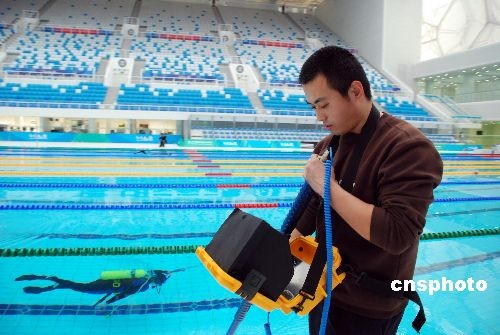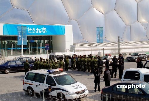 2月15日,北京奧運安保指揮中心防爆安檢部,組織公安民警和解放軍官兵對北京奧運場館“水立方”進行地毯式安全檢查,以確保19日開幕的第16屆世界杯跳水公開賽。中新社發(fā) 楊慧峰 攝