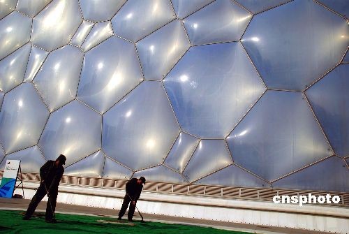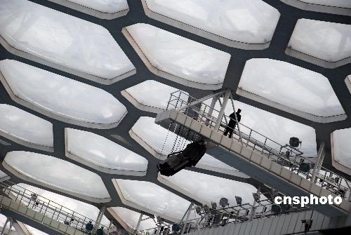 解放軍工兵正對(duì)北京奧運(yùn)場(chǎng)館“水立方”頂層實(shí)施安全檢查。