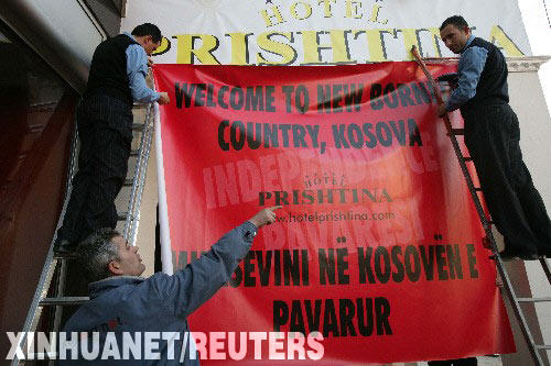 2月14日,在塞爾維亞科索沃的米特羅維察鎮(zhèn),幾名阿族男子在一家旅館前用“歡迎來到新生的科索沃國”的標(biāo)語作裝飾。有消息稱,科索沃將于近日單方面宣布脫離塞爾維亞而獨立。 新華社/路透