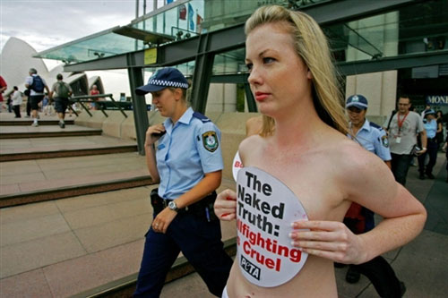圖為多名PETA美女僅以抗議牌子擋住胸前,吸引不少民眾圍觀。