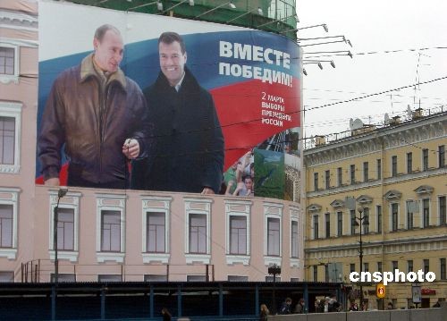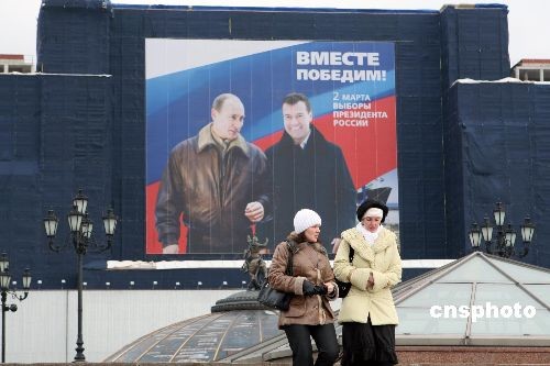 3月1日,在莫斯科紅場旁邊,現任俄羅斯總統(tǒng)普京與政府第一副總理、下屆總統(tǒng)的熱門侯選人梅德韋杰夫的巨幅海報,上書“我們攜手贏取勝利”十分醒目。梅德韋杰夫曾多次表示,他若當選后將繼續(xù)執(zhí)行普京路線。3月2日,俄羅斯將舉行總統(tǒng)大選。中新社發(fā) 田冰 攝