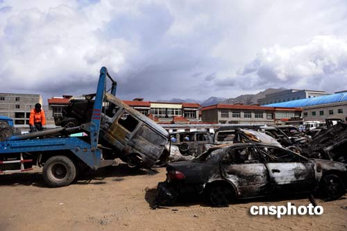 3月19日,拉薩市城關區(qū)環(huán)保局的工作人員正集中處理被焚車輛。