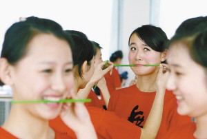 于是,姑娘們每天對(duì)著鏡子練微笑。老師要求每個(gè)人在練習(xí)笑容時(shí),嘴里都要咬著一根筷子找感覺(jué)。這樣一笑就得幾十分鐘,笑得連臉部肌肉都麻了,有時(shí)甚至?xí)テ谱臁?/p>