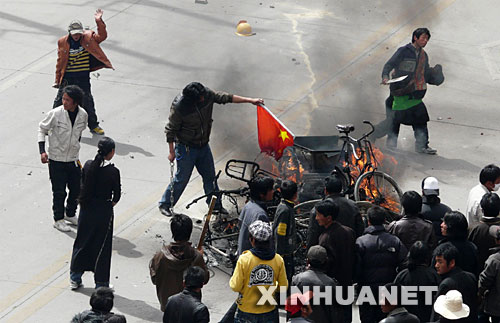 3月14日,一群不法分子在西藏自治區(qū)首府拉薩市區(qū)的主要路段實施打砸搶燒,焚燒過往車輛,追打過路群眾,沖擊商場、電信營業(yè)網(wǎng)點和政府機(jī)關(guān),給當(dāng)?shù)厝嗣袢罕娚敭a(chǎn)造成重大損失,使當(dāng)?shù)氐纳鐣刃蚴艿搅藝?yán)重破壞。事后查明,這天,不法分子縱火300余處,拉薩908戶商鋪、7所學(xué)校、120間民房、5座醫(yī)院受損,砸毀金融網(wǎng)點10個,至少20處建筑物被燒成廢墟,84輛汽車被毀。有18名無辜群眾被燒死或砍死,受傷群眾達(dá)382人,其中重傷58人。拉薩市直接財產(chǎn)損失達(dá)24468.789萬元。