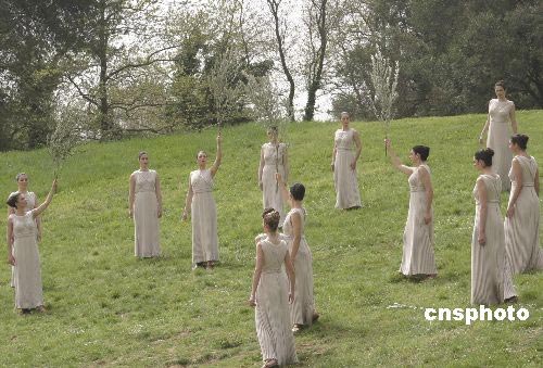當(dāng)?shù)貢r(shí)間3月23日,北京奧運(yùn)圣火采集最后一次彩排在希臘古奧林匹亞遺址舉行,女祭司手擎橄欖枝不斷變幻隊(duì)形,在山坡上舞蹈。中新社發(fā) 王歡 攝