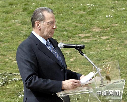 希臘當(dāng)?shù)貢r間3月24日,北京二00八年奧運(yùn)會圣火采集儀式在古奧林匹亞競技場舉行。國際奧委會主席羅格致辭。中新社記者 王歡