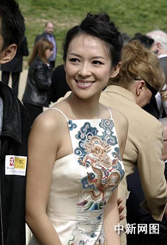 希臘當(dāng)?shù)貢r(shí)間3月24日,北京二00八年奧運(yùn)會(huì)圣火采集儀式在古奧林匹亞競(jìng)技場(chǎng)舉行。作為希臘奧委會(huì)的特邀嘉賓,中國(guó)著名影星章子怡身著極具中國(guó)韻味的絲綢禮服出席采集儀式。 中新社記者 王歡