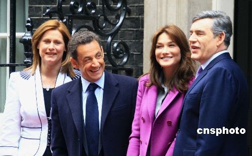 當(dāng)?shù)貢r間3月27日中午,正在英國進(jìn)行國事訪問的法國總統(tǒng)薩科奇攜新婚妻子布魯尼,與英國首相布朗在唐寧街10號會見。中新社發(fā) 李鵬 攝