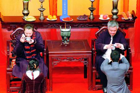 我覺得一個團隊要有點規(guī)矩,師徒之間要有一種傳統(tǒng)。我是一個民間藝人,我經(jīng)營二人轉(zhuǎn)從沒有到有,從不景氣到想看買不到票,這個過程給我?guī)砗艽蟮氖斋@。那些學生,之前我都已經(jīng)一批一批收完了,我想在那天給他們一個證書、給他們一個忠告,讓他們知道趙門的規(guī)矩,怎么做人。那天收了35個,只有四五個是新收的學生,只是有一個排序,我給他們發(fā)了一個聘書,發(fā)了一個我給他們寫的字畫。