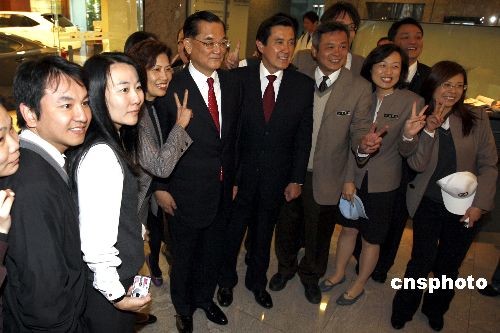 臺灣地區(qū)領(lǐng)導(dǎo)人當(dāng)選人馬英九上午拜會中國國民黨榮譽(yù)主席連戰(zhàn)。會后和工作人員與市民一起合影。中新社發(fā) 杜洋 攝