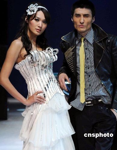 圖為名模胡東(右)、韋杰(左)現(xiàn)場(chǎng)演繹拉鏈時(shí)裝秀。