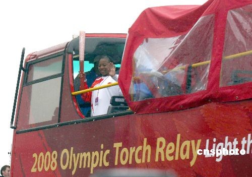 4月6日上午10時32分,倫敦大雪紛飛,獲得過五枚奧運金牌的英國劃艇名將史蒂夫·瑞格夫手持祥云火炬穩(wěn)步跑出倫敦西北的溫布利體育場,北京奧運圣火傳遞“和諧之旅”第四站隨之吹響號角。倫敦是北京奧運圣火境外傳遞過程中,傳遞路線最長、最復雜的城市。約八個半小時的圣火傳遞,包括了輪船、自行車、敞篷公共汽車、輕軌等四種特殊傳遞方式。圖為第二棒火炬手乘坐具有倫敦特色的紅色雙層巴士離開溫布利體育場。中新社發(fā) 沈晨 攝