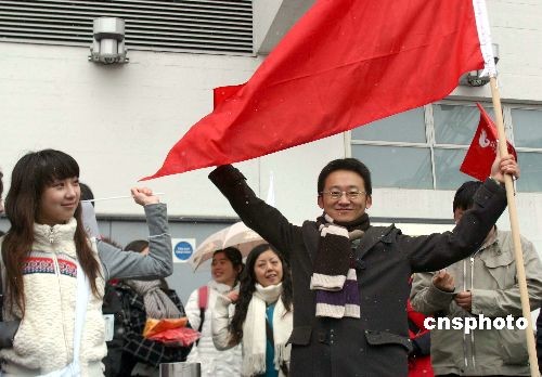圖為中國留學(xué)生在溫布利體育場外為奧運(yùn)圣火助威。 沈晨 攝