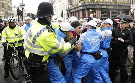 4月6日的圣火傳遞過(guò)程中,不斷有人滋事,倫敦警方為此拘捕數(shù)名鬧事者