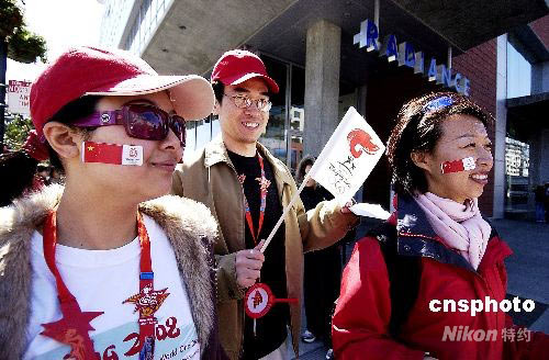 當(dāng)?shù)貢r(shí)間四月九日,北京奧運(yùn)火炬在美國(guó)舊金山傳遞。兩名華人女青年為支持北京奧運(yùn),將自制的中國(guó)國(guó)旗和北京奧運(yùn)標(biāo)志貼在臉上參加傳遞活動(dòng)。陳鋼 攝