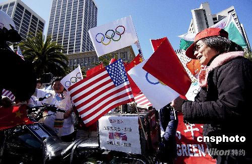 當?shù)貢r間四月九日,北京奧運火炬在美國舊金山傳遞,當?shù)厝A人華僑傾力出動為北京奧運圣火傳遞活動加油。 陳鋼 攝