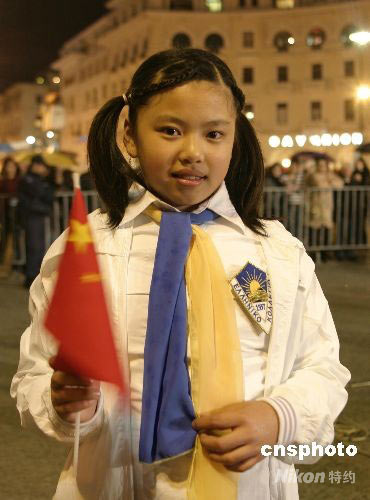 希臘當?shù)貢r間3月27日,北京奧運圣火希臘境內(nèi)第四天傳遞,在當天的終點塞薩洛尼基舉行慶典儀式。圖為童聲合唱團中唯一的華人女孩王佩珺。 王歡 攝