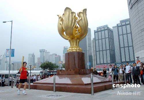 最后一名跑手手持模擬奧運(yùn)火炬順利抵達(dá)終點(diǎn)站--金紫荊廣場。 鄧慶樂 攝