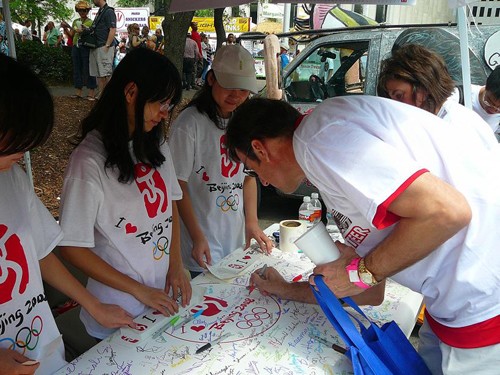 在現(xiàn)場(chǎng)擺設(shè)的“簽名支持北京奧運(yùn)”攤位前,光臨這里的美國(guó)客人從開攤到收攤一直絡(luò)繹不絕。有許多美國(guó)朋友在聽留學(xué)生們講完關(guān)于“北京奧運(yùn)對(duì)于中國(guó)人民的重大意義”, “北京奧運(yùn)目前的籌備情況”等話題之后,當(dāng)即表示,我們完全支持你們的北京舉辦這屆奧運(yùn)會(huì),我們不同意任何人提出的“抵制北京奧運(yùn)”的任何理由。有幾位曾經(jīng)到過(guò)北京的美國(guó)人對(duì)他們的同伴介紹說(shuō):我門去過(guò)北京的,那是一個(gè)既古老又新興的漂亮城市,在北京舉辦奧運(yùn)會(huì),絕對(duì)是本屆奧運(yùn)會(huì)的最佳選擇! 他們都十分肯定地在由中國(guó)留學(xué)生準(zhǔn)備的簽名大橫幅上簽下了自己的名字。