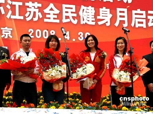 4月30日上午,江蘇省體育局主辦“迎奧運(yùn)倒計(jì)時(shí)100天慶;顒(dòng)暨江蘇省全民健身月啟動(dòng)儀式”,奧運(yùn)冠軍林莉、葛菲、閻森、欒菊杰和群眾一道紛紛爭相在巨大的橫幅上簽字。中新社發(fā) 維勇 攝