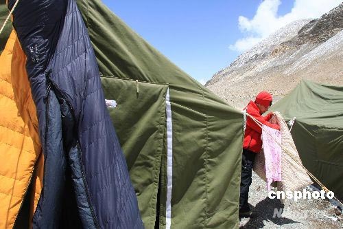 圖:珠峰大本營記者抓緊時機晾曬臥具 (2)