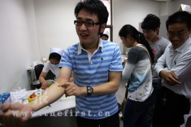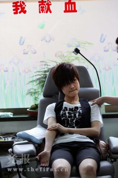 何潔、黃雅莉是約好一起開車到血液中心的,并在車上填完獻(xiàn)血申請表?吹窖褐行木谷挥羞@么多人在獻(xiàn)血,她們也很激動,“不知道這么多人都會來啊,都是為災(zāi)區(qū),感覺很感動!焙螡嵳f:“我以前在四川上學(xué),已經(jīng)問候了那邊的朋友,他們都很平安。今天是我第一次獻(xiàn)血,感覺還好吧。”同來的黃雅莉雖然緊張,但還是很期待:“哎,不就是抽點(diǎn)血嘛,抽完了就好啦!痹诼犝f好朋友李宇春也來獻(xiàn)血時,她們很關(guān)心:“春春暈血,她現(xiàn)在沒事吧!辈贿^在進(jìn)入驗血室時,剛剛還一副豁出去樣子的黃雅莉卻像孩子一樣跟公司的工作人員說:“其實我還是有點(diǎn)緊張哈!”但是她在何潔抽血時,卻不停地給同伴鼓勵:“何潔,別緊張,我支持你哦!”
