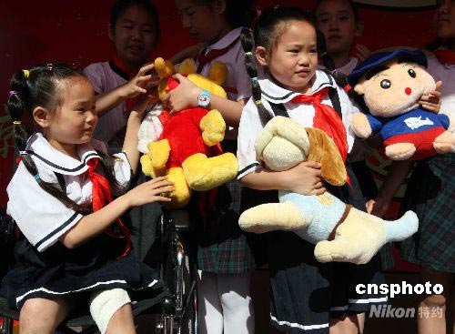 五月三十日,來自四川地震災(zāi)區(qū)北川小學(xué)的雙胞胎姐妹席大雙(右)、席小雙來到北京一所學(xué)校與這里的師生共度六一兒童節(jié),享受節(jié)日的快樂。學(xué)生們?yōu)樗齻兯蜕狭嗽S多節(jié)日的禮物。中新社發(fā) 任海霞 攝