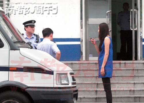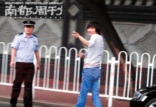 張亞東下車一邊向警察說著什么,一邊含笑指著記者的汽車。