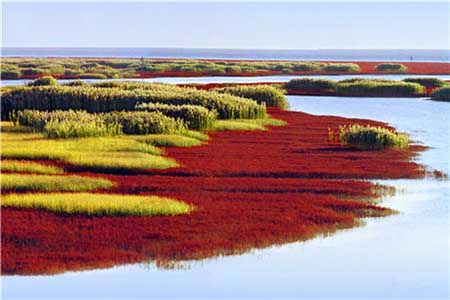 盤(pán)錦,地勢(shì)平坦,景觀獨(dú)特,資源豐富,可謂物華天寶,被稱作美麗、富饒的遼河金三角。距北京600多公里的遼寧盤(pán)錦有一片海灘,秋天一到,海邊的植物慢慢變紅,大片紅色鋪滿整個(gè)海灘,異常壯觀。