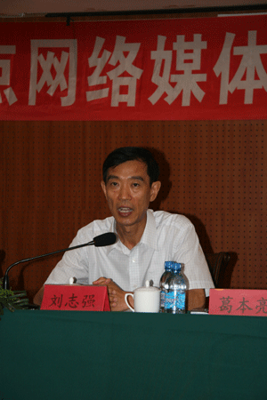中共錦州市委書記劉志強向全國網(wǎng)絡(luò)媒體記者介紹錦州的發(fā)展狀況。