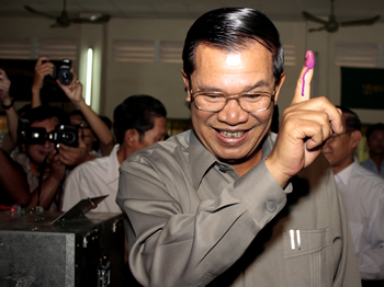 柬埔寨首相洪森周日選舉投票后表情輕松。(金邊郵報圖)