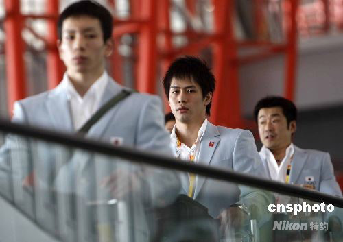 7月31日,日本體操男隊抵達北京首都國際機場。日本體操隊領軍人物福田洋之(中)隨隊抵達。中新社發(fā) 杜洋 攝