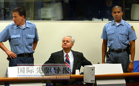 這是2003年2月13日,米洛舍維奇生前在同一法庭出庭受審時(shí)的情景。
