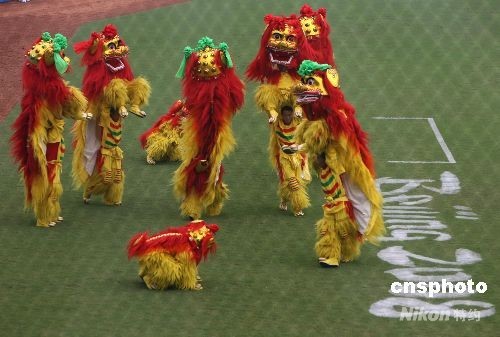 北京奧運會棒球比賽舞獅表演。中新社發(fā) 武仲林 攝