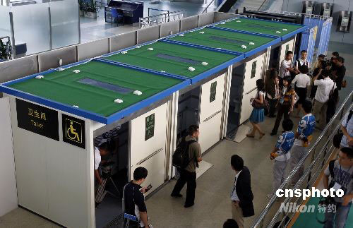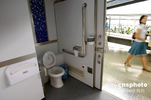 圖為2號航站樓01號遠機位大棚加裝的臨時無障礙衛(wèi)生間。中新社發(fā) 杜洋 攝