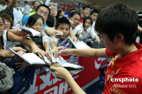 圖為球迷爭要乒乓國手郭躍簽名。中新社發(fā) 湯彥俊 攝