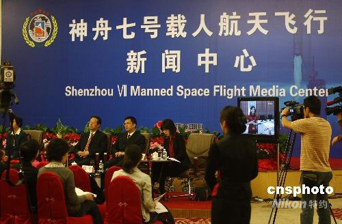 9月25日,在北京梅地亞中心召開的“神舟七號載人航天飛行”新聞發(fā)布會上,中國載人航天工程研究員劉國寧、飛船系統(tǒng)設(shè)計師王南華、長征二號丙運(yùn)載火箭總設(shè)計師鄭全寶等四位專家,就神舟七號的一系列問題回答記者提問。中新社發(fā) 杜洋 攝